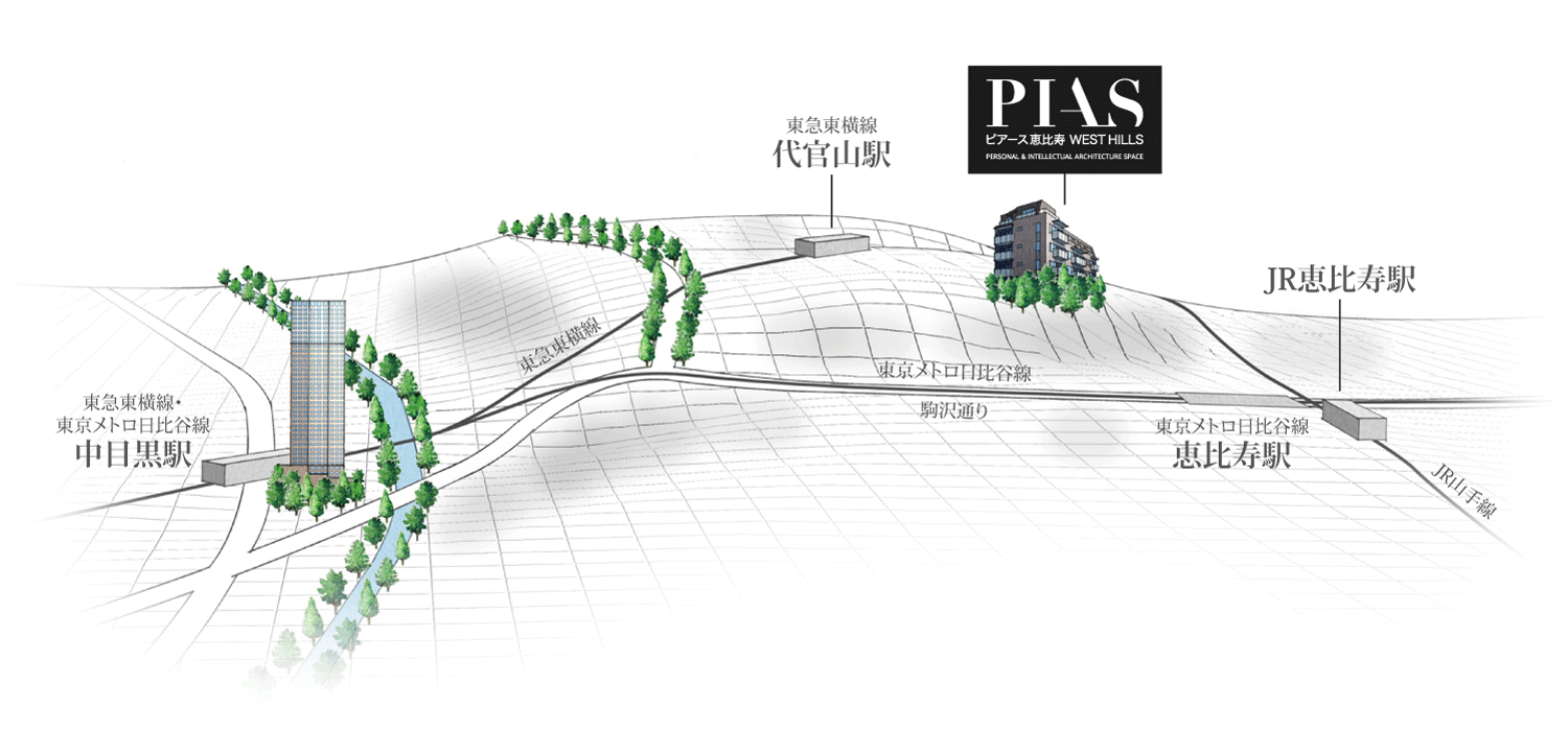 「PIAS恵比寿 WEST HILLS」は、この2つの街の中間にあり、人々が訪れたい街を、さりげなく普段着感覚で使いこなせます。