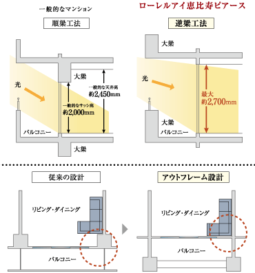 バルコニー(一部除く)に面する天井側の梁をなくすことで光を空間の奥まで効率よく採り入れる逆梁工法に加えて、リビング・ダイニングには約2,700mm(A〜Dタイプ)・約2,600mm(E〜Iタイプ)のハイサッシを採用。明るく開放感に満ちた住空間を実現しています。また、すっきりとした空間をつくり、家具もレイアウトしやすいアウトフレーム設計も採用しています。