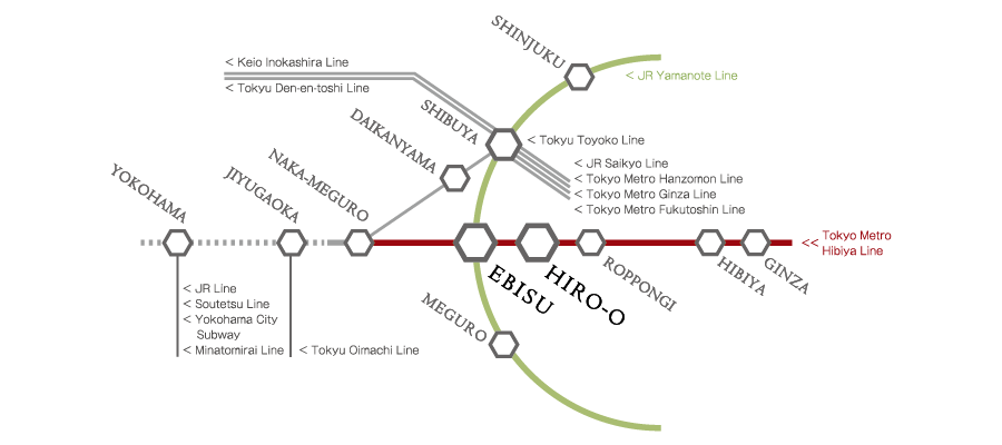 JR「恵比寿」駅からは、山手線、埼京線、湘南新宿ラインが利用可能。渋谷・新宿・池袋・品川はもちろん、横浜ともダイレクトで結ばれます。また、東京メトロ日比谷線「広尾」駅からは、六本木・霞ヶ関・銀座へ直通。大手町・赤坂・日本橋へも、1回の乗り換えでアクセスできます。それはまさに、縦横無尽の交通ネットワーク。ビジネスに、プライベートに、都心居住の真価を、日々実感していただけるポジションです。