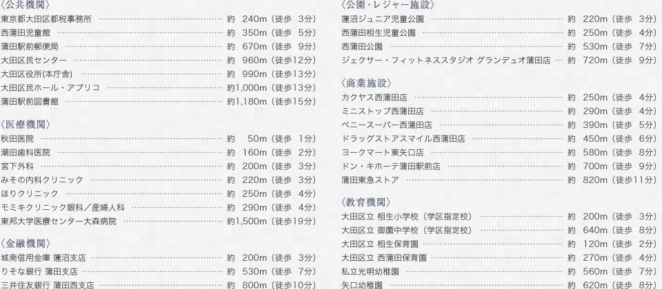 JR「蒲田」駅周辺には「大田区役所」や「蒲田駅前図書館」などの公共施設が集積。住まいから徒歩4分の場所には、住民票や印鑑登録証明書の発行が行える「蒲田西特別出張所」があり、大変便利です。「蒲田駅前図書館」や「ニッセイ・アロマスクエア」「大田区民ホール・アプリコ」などの文化施設も徒歩圏です。