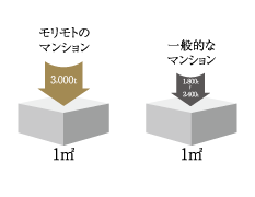 高強度のコンクリート - 建物を支える柱、梁、床、壁などには、鉄筋コンクリート造を採用しました。一般に使用するコンクリート強度の18〜24N/mu(1uあたり約1800〜2400トンの圧縮に耐える性能)を上回る30N/mm2の耐圧性能を確保しています。最大で1uあたり約3000トンもの圧力に耐える強度があります。※100年の暮らしを守るとは、日本建築学会「建築工事標準仕様書」において「設計基準強度がFc30N/mm2であれば構造体の大規模な修繕をしなくても100年はもつ」といわれているものです。ただし100年という数値は理論値でマンションのメンテナンスが100年不要だということではありません。