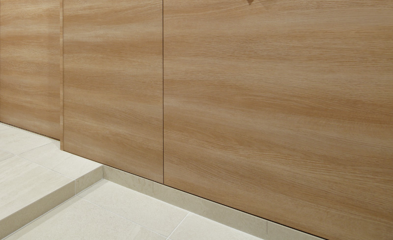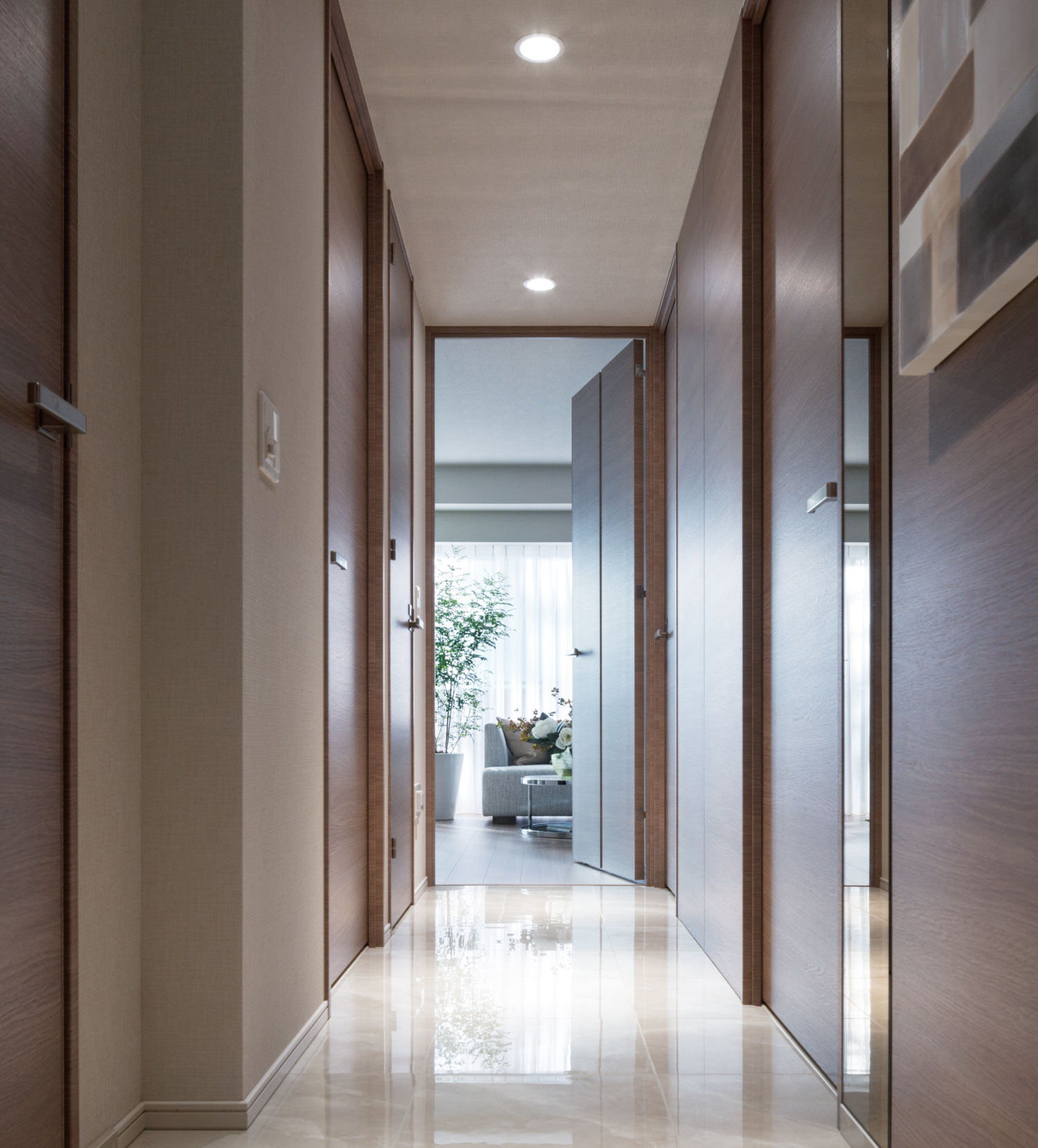 - 玄関・廊下壁片面には、木目調パネルを標準採用しています。※B1階住戸の木目調パネルは不燃仕様になり、実際には厚みが異なります。