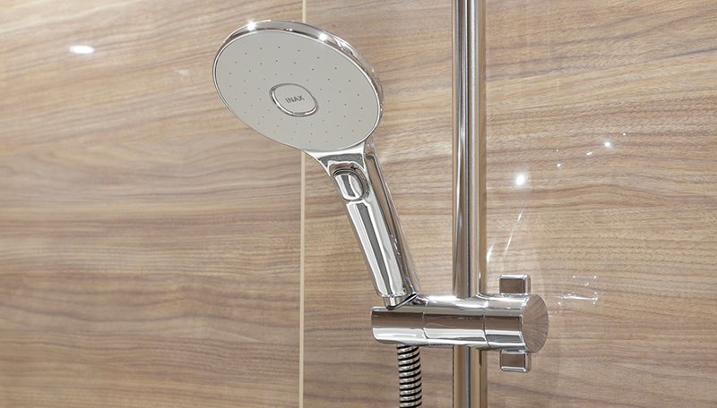- シャワー内の圧力を上げることで、心地よい浴び心地と節水を両立させたシャワーです。手元のスイッチで吐水・止水の切り替えが可能なため、高い節水・省エネを実現します。