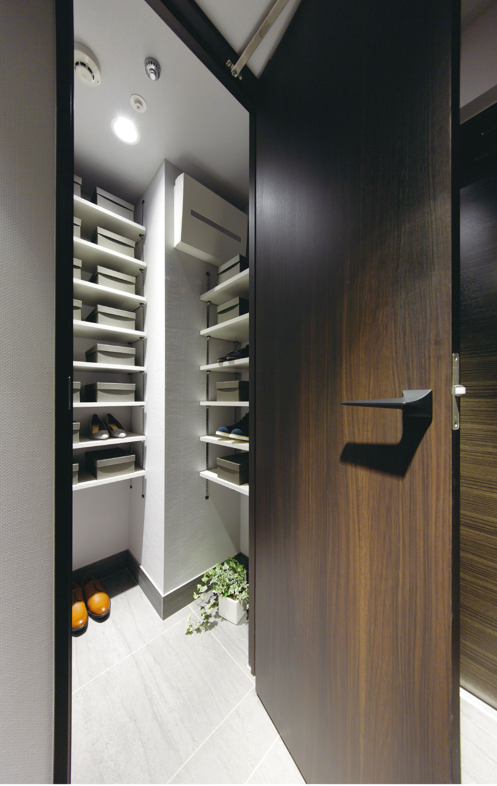- 玄関横には大容量のシューズインクローゼットをご用意。靴を履いたまま入れ、アウトドア用品など外で使用するアイテムの収納にも便利です。※タイプにより形状が異なります。※一部のタイプのみ。