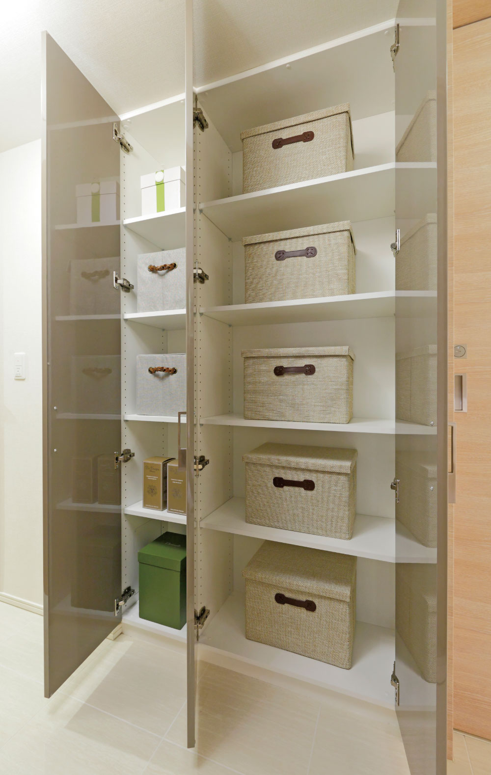 - 棚を複数設けることで、細々した物もキッチリ収められる物入を専有部各所に設置。生活雑貨や工具など毎日使うものの収納に便利です。※タイプにより形状が異なります。