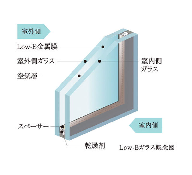 - 複層ガラスの内側に熱の伝わりを抑えるLow-E膜をコーティング。冬場に熱の流出が抑えられ、結露の発生も抑制します。