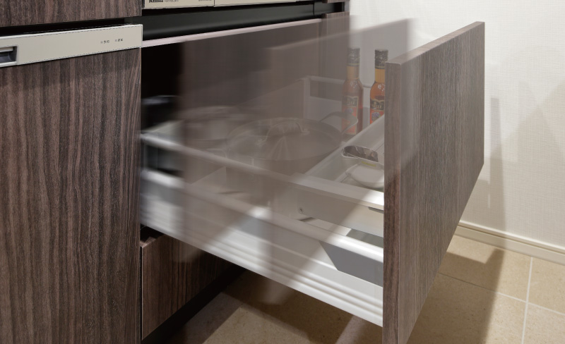 - 引出を軽く押すだけで緩やかでスムーズに閉まるので、衝撃・音を軽減すると共に指はさみが防止できます。