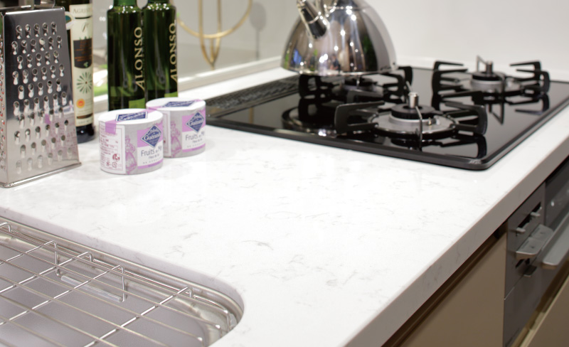 - キッチンのカウンタートップには水晶含有率90%以上のフィオレストーン(人造石)を採用。衛生的で汚れ・傷に強く、デザイン性・耐久性ともに優れた素材です。