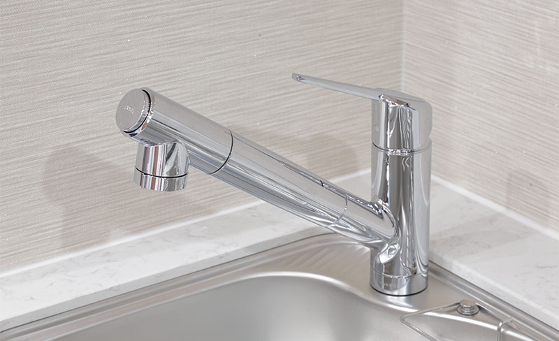 - キッチン水栓は、ホースを引き出せるのでシンク内の洗浄も簡単です。浄水・原水のワンプッシュ切り替えや浄水シャワーなど、使い勝手に優れた水栓です。※ユーティリティシンクの場合水栓取付位置はカウンターの上になります。