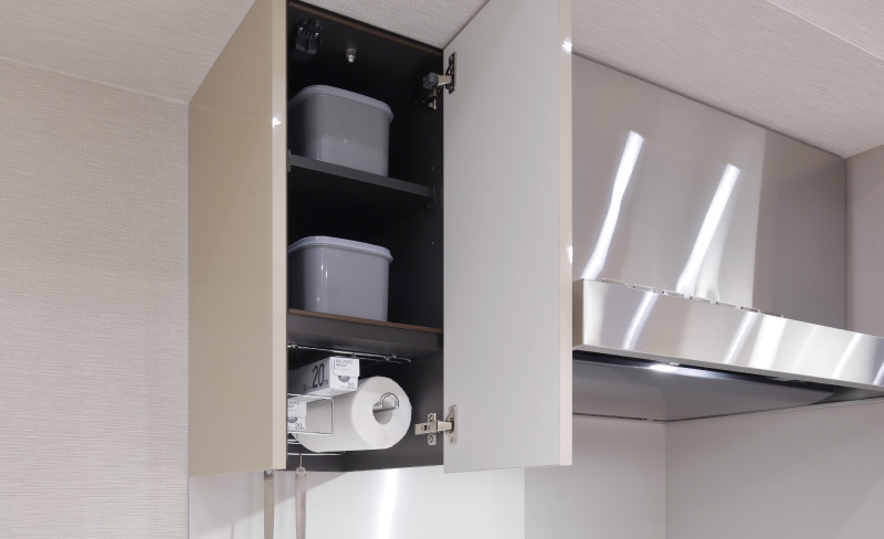 - キッチンペーパーやラップ、キッチンツールが収納できる便利な吊戸棚。ゆっくり静かに閉まるブルモーション丁番を採用しています。
