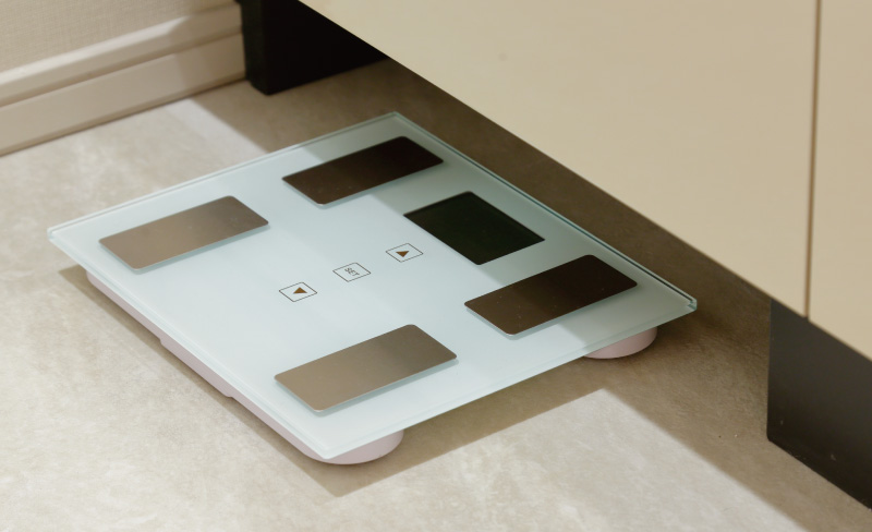 - 洗面化粧台の最下部はヘルスメーターが納められるスペースで、使う時にすぐ出せて便利です。