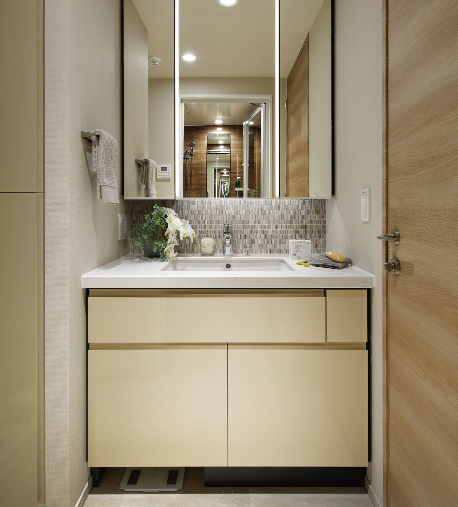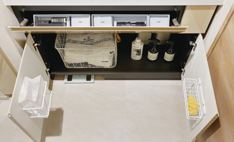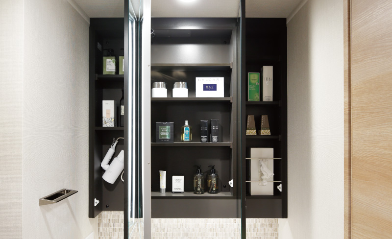 - 排水管を奥に設けることにより、下部収納スペースを広く確保した洗面化粧台には、洗面用品や洗濯用品などがたっぷり収納できます。