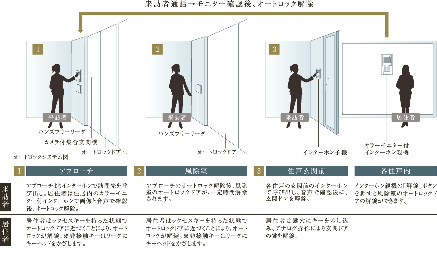 - アプローチ・風除室で、セキュリティをかけるオートロックシステムを採用しました。インターホン親機にて風除室のテレビカメラ付集合インターホンで来訪者を確認の後、オートロック解錠ボタンで扉を解錠できます。