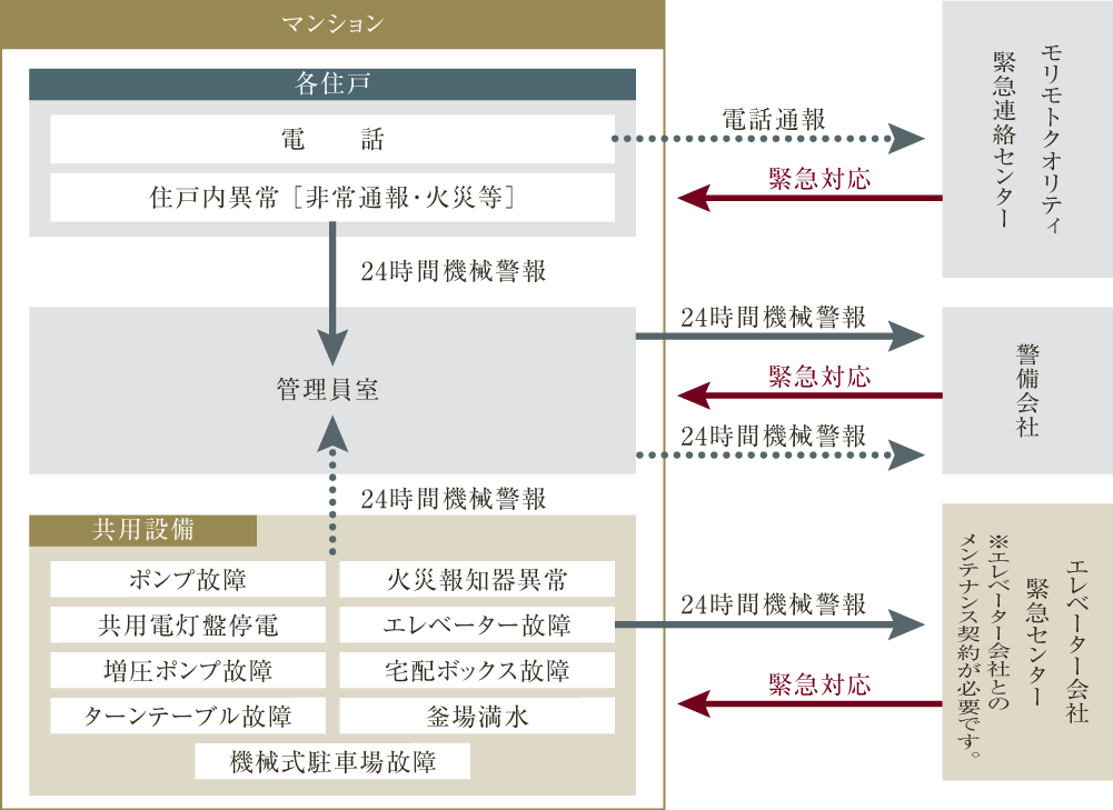 - 各住戸からの各警報(非常通報)は、管理員室を拠点として、24時間体制となっておりますので、各住戸より異常信号が発信された際は、警備員が現場へと出動致します。又、建物内の設備異常(各ポンプ・エレベーターの故障)についても、24時間体制で待機しておりますので、異常が発生した際には緊急要員が現場へと出動し、復旧作業を迅速に行います。