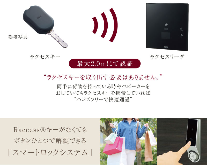 - ハンズフリーシステムRaccess(ラクセス)は、かざすタイプのノンタッチキーもご利用可能です。リーダにノンタッチキーをかざすことで認証されます。(各住戸2本)