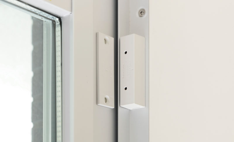 - 1階とルーフバルコニーの窓、玄関ドアには、防犯センサーを設置しています。防犯警戒中に、センサーが設置された窓を開けるとインターホン親機にて音声警報を発し、周辺に異常を伝えます。(FIX窓と面格子付き窓には付きません)