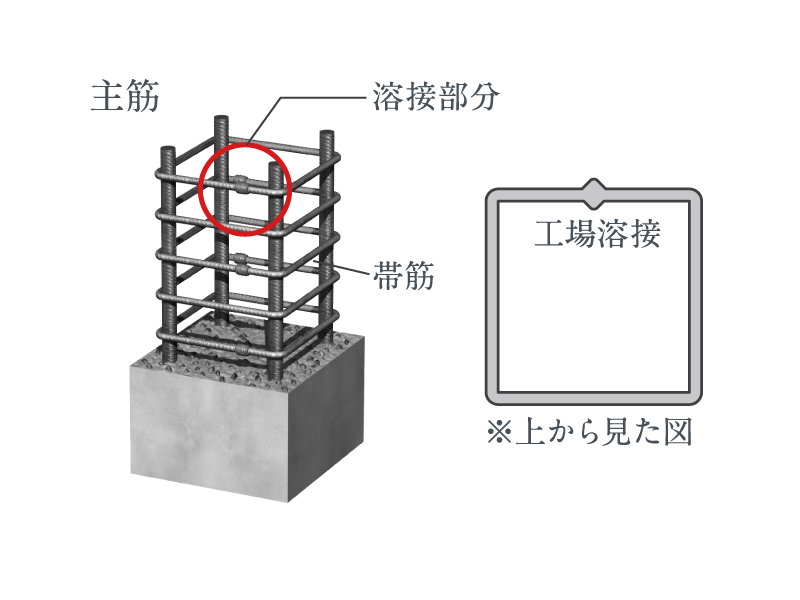 - 溶接閉鎖型フープとは工場で特殊溶接をして閉じた形にした帯筋のことで、コンクリートを拘束する能力が高く、一般的な帯筋よりも大地震時の粘り強さに優れています。(梁との接合部を除く)