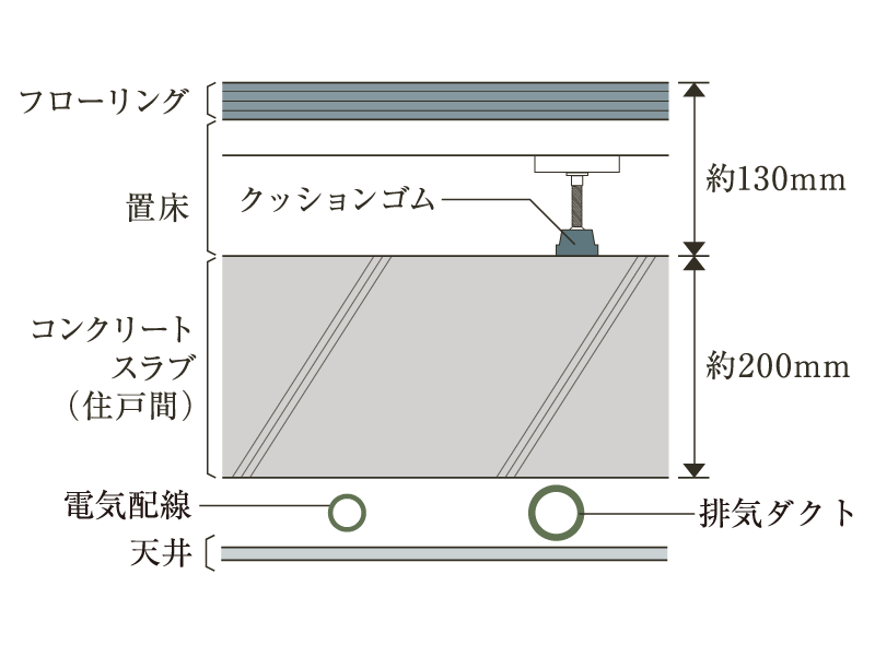 - 住戸間の床コンクリート厚み約200mm以上のスラブを採用