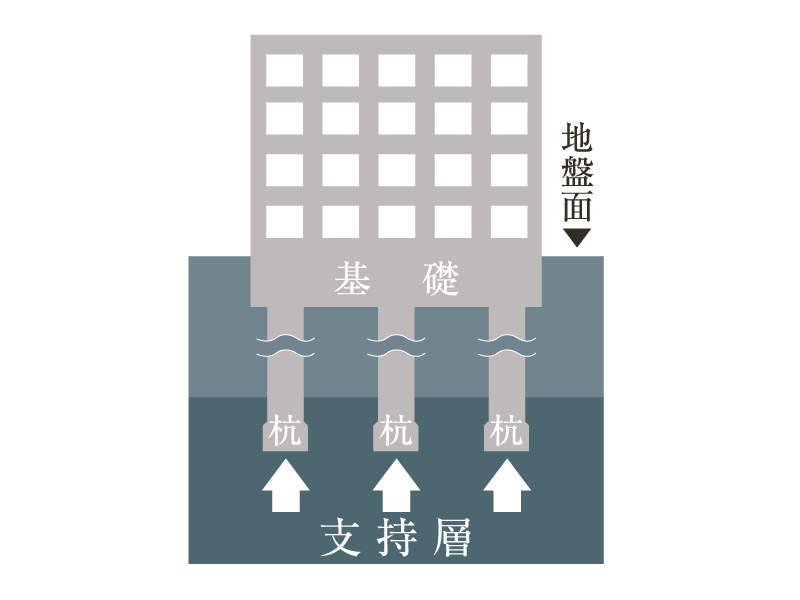 「ピアース宮前平レジデンス」では、23本の場所打ちコンクリート杭を地中深く(深度:設計GLから約15m以深)にあるN値50以上の支持層に貫入して支持しています。これにより通常時には、建物をしっかり支え、地震時には地震に抵抗しうる強度と剛性を確保しています。