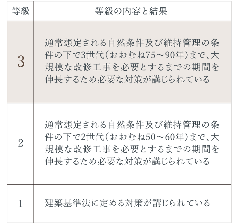 - 住宅性能表示制度における劣化対策等級で最高の「3」を取得。概ね75~90年の耐久性を実現しています。