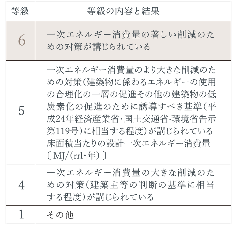 - 設備の性能や省エネを総合的に評価する一次エネルギー消費量等級で「6」を取得。