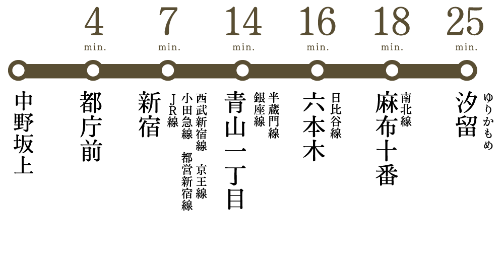 「中野坂上」駅からは、丸の内線で霞ヶ関、銀座、大手町、東京に直結、大江戸線で青山一丁目、六本木、麻布十番、汐留に直結。