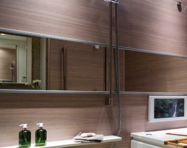 - 浴槽に浸かりながらでも使える横長サイズ。見やすさや使いやすさに加え、広々とした空間のゆとりが感じられます。