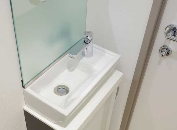 - レストルーム内にはミラーが付いた手洗器を設置。手洗器の水栓は節水効果がある自閉式水栓(グローエ社)を採用しました。