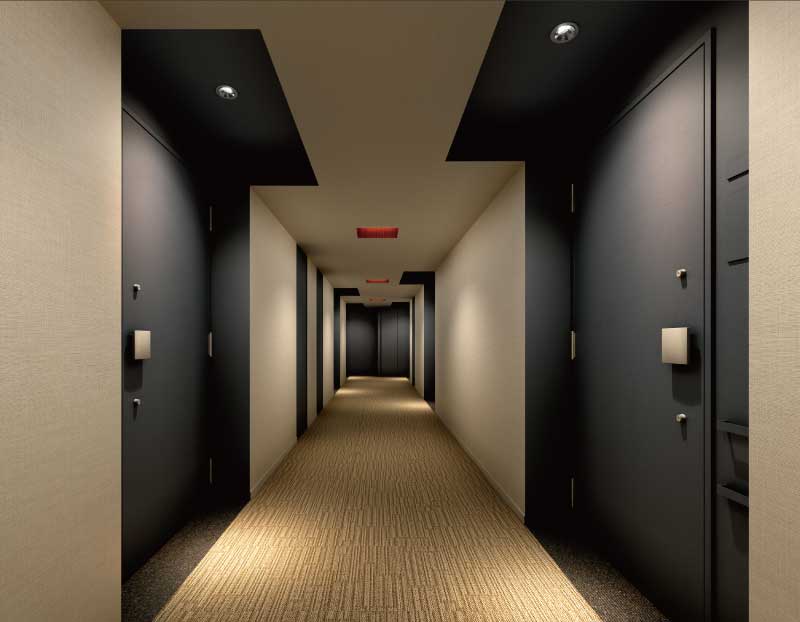 棟内すべてのフロアで内廊下設計を採用。外部からの施設を遮断し、暮らしのプライベート性とセキュリティ性を高める。ホテルライクな内廊下が、専有部へと続くひとときを美しく演出する。