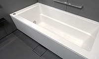 浴室には浴槽またぎの少ない安全な低床型ユニットバスを採用しています。さらに浴槽の壁には手すりを設置し、万一の事故を防ぐよう配慮しています。 |