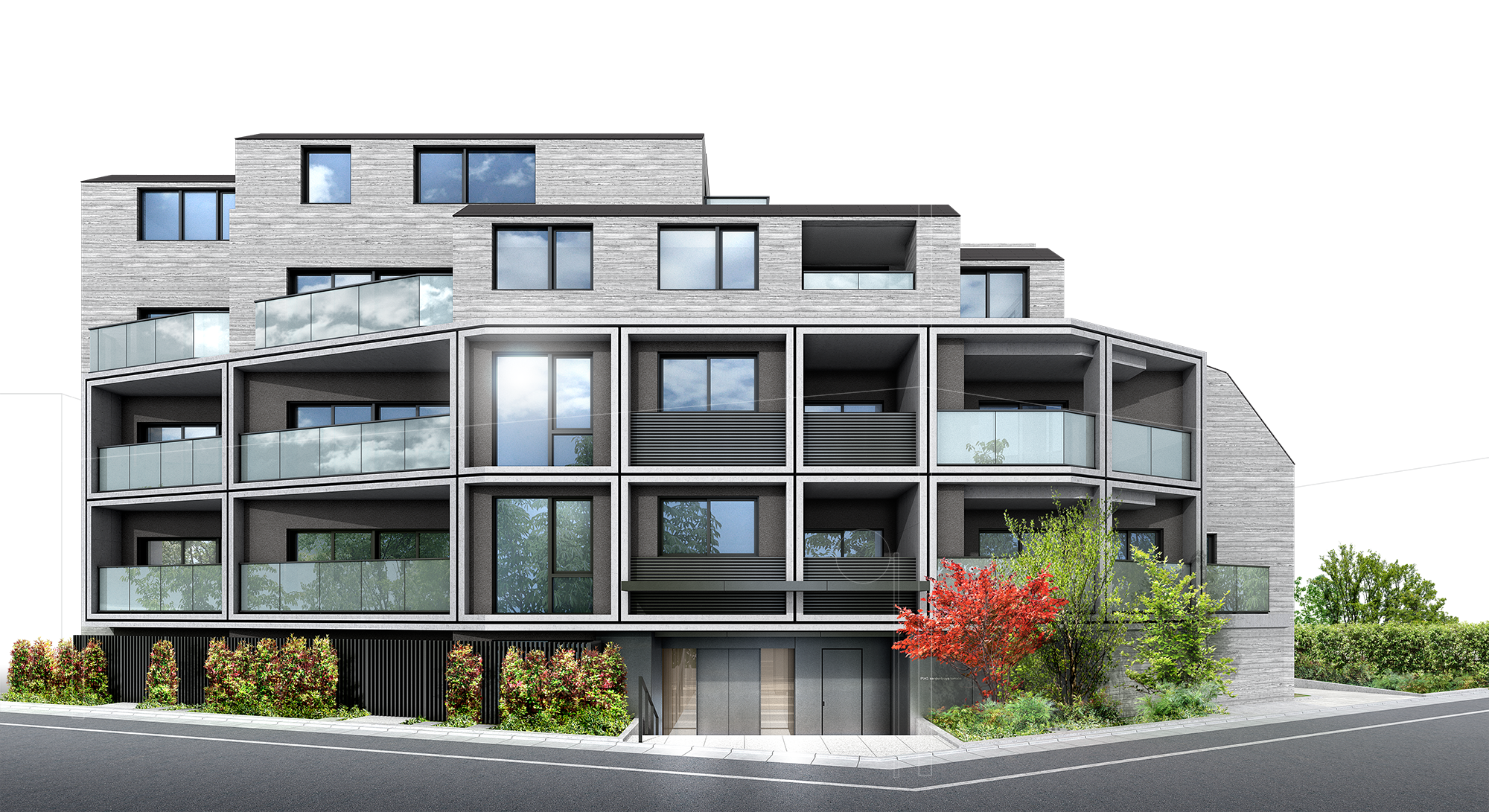 本計画は緑道沿いの“第一種住居地域”に位置し、5階建てのスケールを実現。