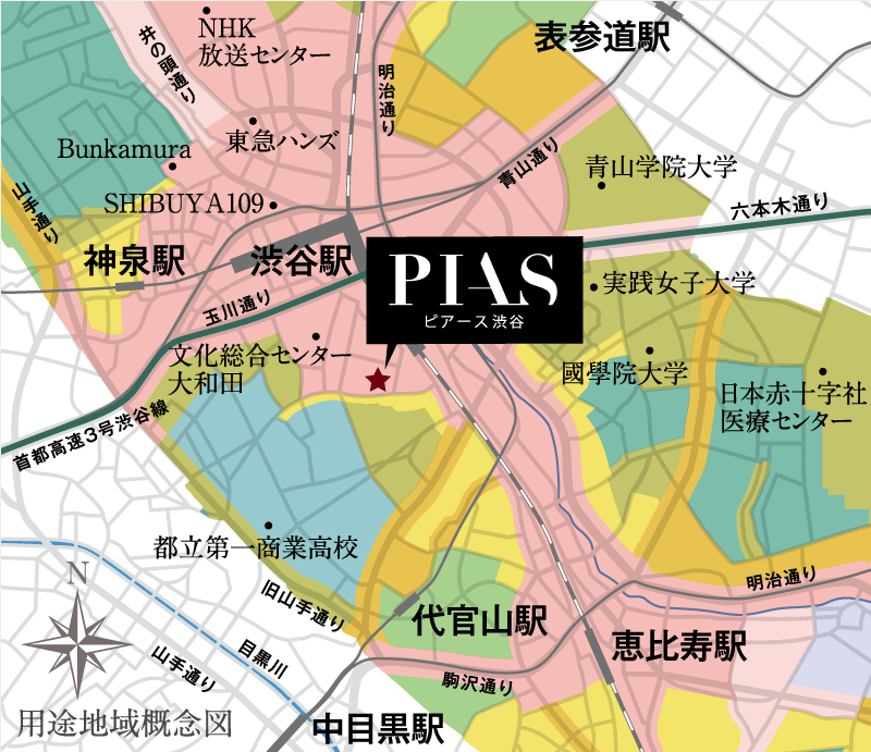 駅を中心に広がる商業地域の端に「ピアース渋谷」は位置しています。隣接するのは、暮らすための街づくりが行われている住居地域。ここは、渋谷らしい賑わいと落ち着いた環境が共存する場所。