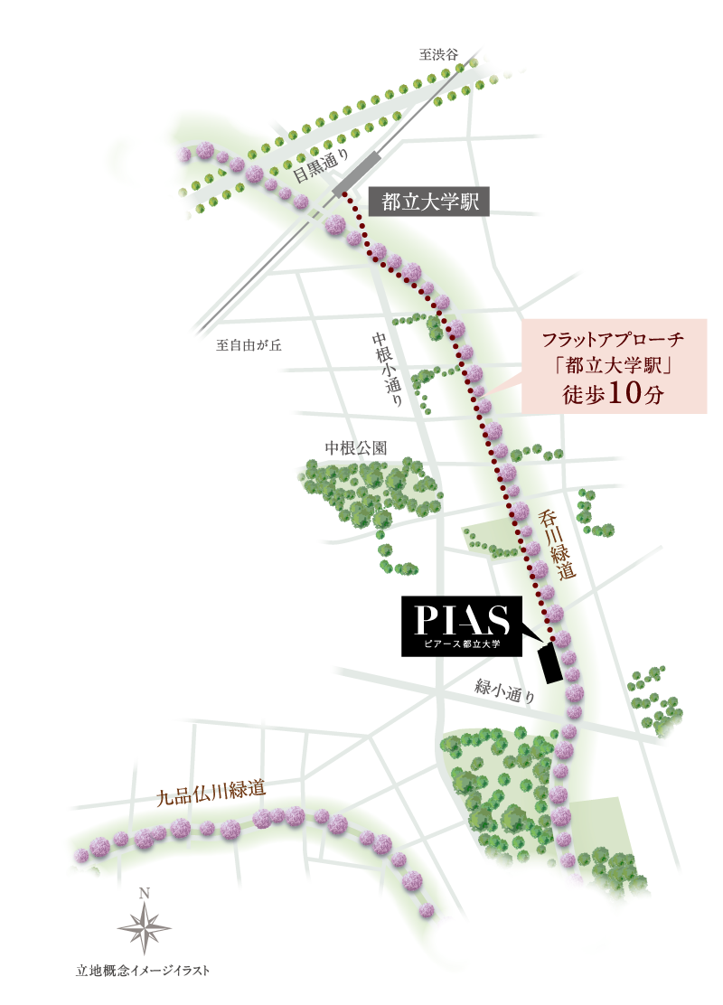 「都立大学」駅から「ピアース都立大学」までは、桜並木がつづく吞川緑道を歩く。木漏れ日の中、心地いい風に吹かれながらの道行きは都市では得難いもの。この小径では、歩くことが休息となる。